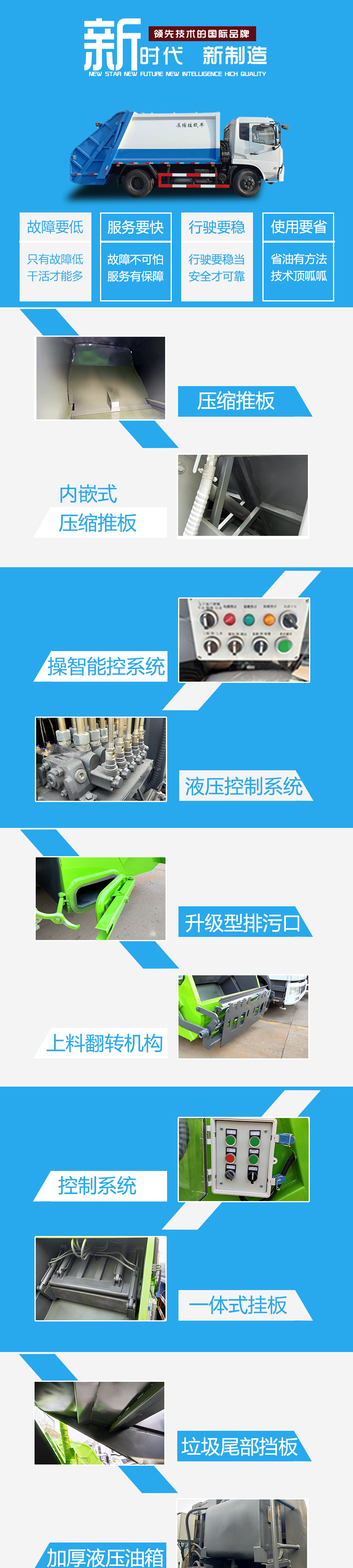其它 | 1、3950和4500兩種軸距。2、選裝翻轉:三角斗,掛桶裝置,擺臂裝置,大落地斗裝置。自帶abs,行車記錄儀 | ||